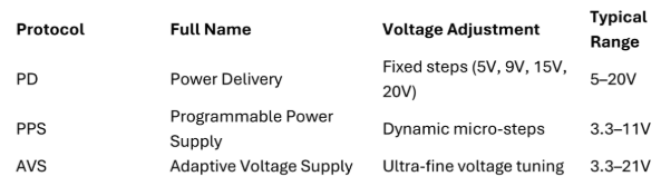 Long story short, the main difference is voltage flexibility. Here’s a slightly longer explanation in simple terms: PD has fixed voltage levels. PPS changes voltage by small steps of 20mV, in order to control heat. AVS, the newest standard, gives you more accurate control. This affects charging speed, heat, and as are sult, battery health over time.