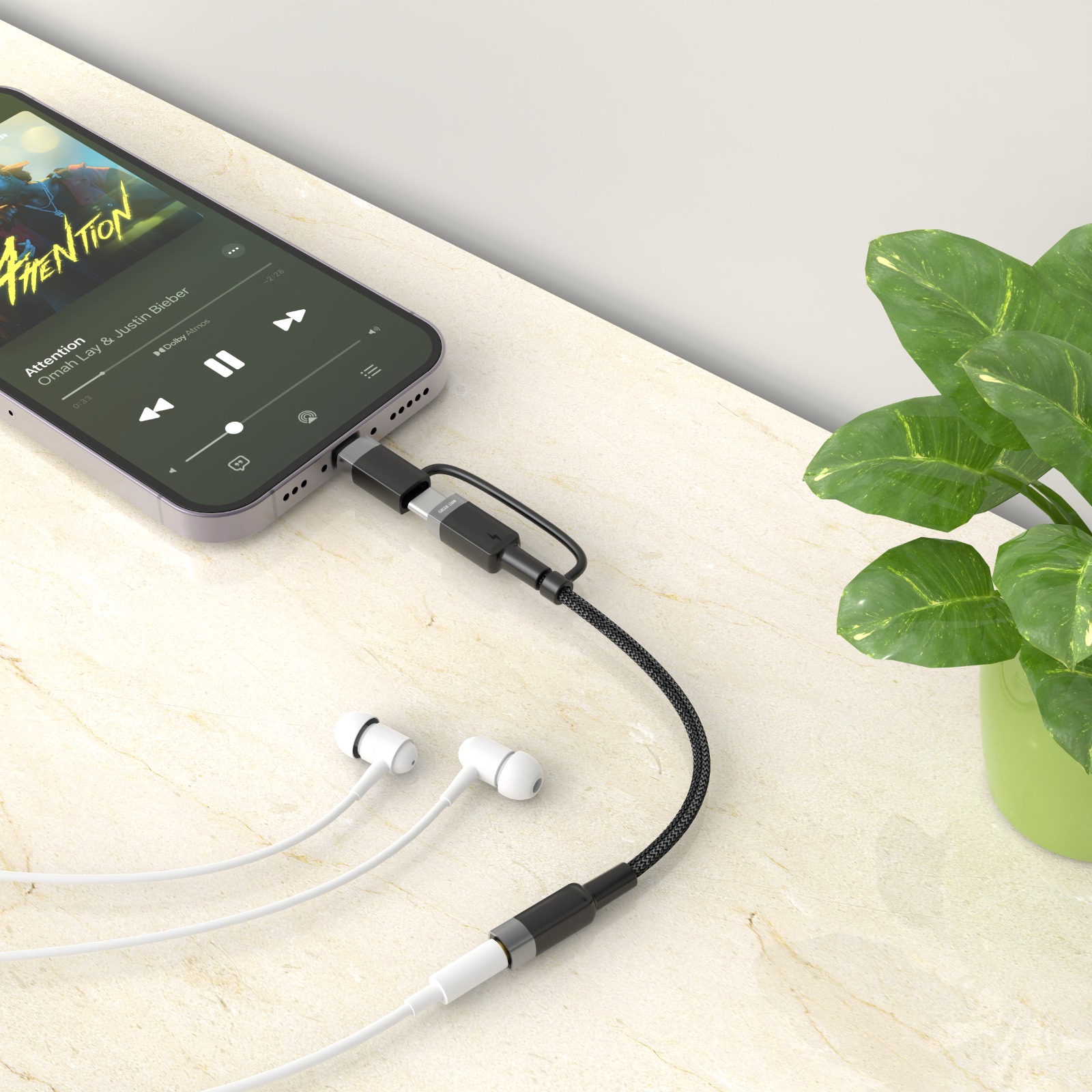 Green Lion 2 IN 1 AUDIO CABLE 12CM USB-C, LIGHTNING TO 3.5 MM JACK . This is a high-quality 3.5mm female to USB-C/Lightning audio adapter designed for reliable and clear sound transmission. Constructed with a combination of 48-strand braided wiring and an aluminum alloy casing, the adapter offers both durability and a premium feel. It features an impedance of 46 Ω and a signal-to-noise ratio (SNR) of 95 dB, ensuring clean audio output with minimal interference. Supporting 24-bit, 96kHz audio quality, it delivers crisp and detailed sound for music, calls, or media playback.