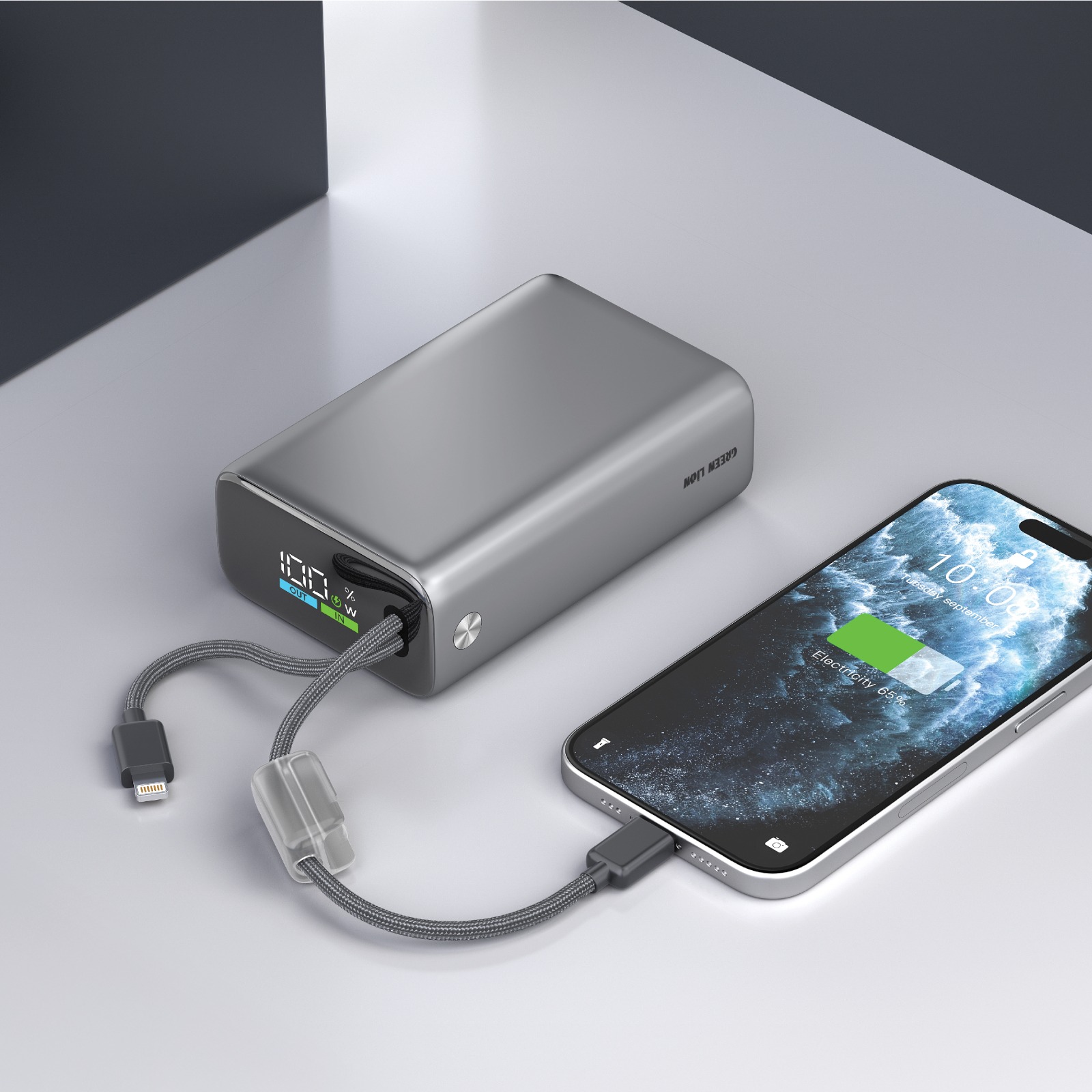 Green Lion IBIZA  20000mAh Power Bank 45W. This power bank is made from durable ABS and PC materials and comes with a large 20,000mAh battery capacity, making it ideal for extended use and multiple device charges throughout the day. It supports fast charging through a USB-C port with input up to 30W Power Delivery for quick recharging of the power bank itself, and output up to 45W for efficient charging of smartphones, tablets, and some lightweight devices. It includes a USB-C port and a built-in USB-C cable, as well as a built-in Lightning cable with up to 12W output, offering convenient compatibility with different devices without the need for extra cables. The device also supports simultaneous charging, although the total shared output is limited to 15W when multiple devices are connected. Additional features include a compact design with a 17 cm USB-C cable and a 10 cm Lightning cable, a real-time colorful display to monitor battery status, and a braided strap for durability and easy carrying. It is flight approved, making it a practical and travel-friendly charging solution.