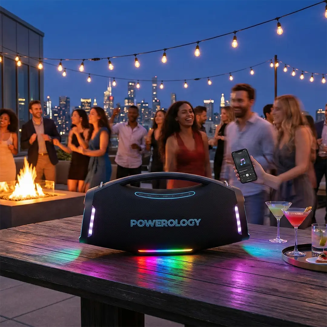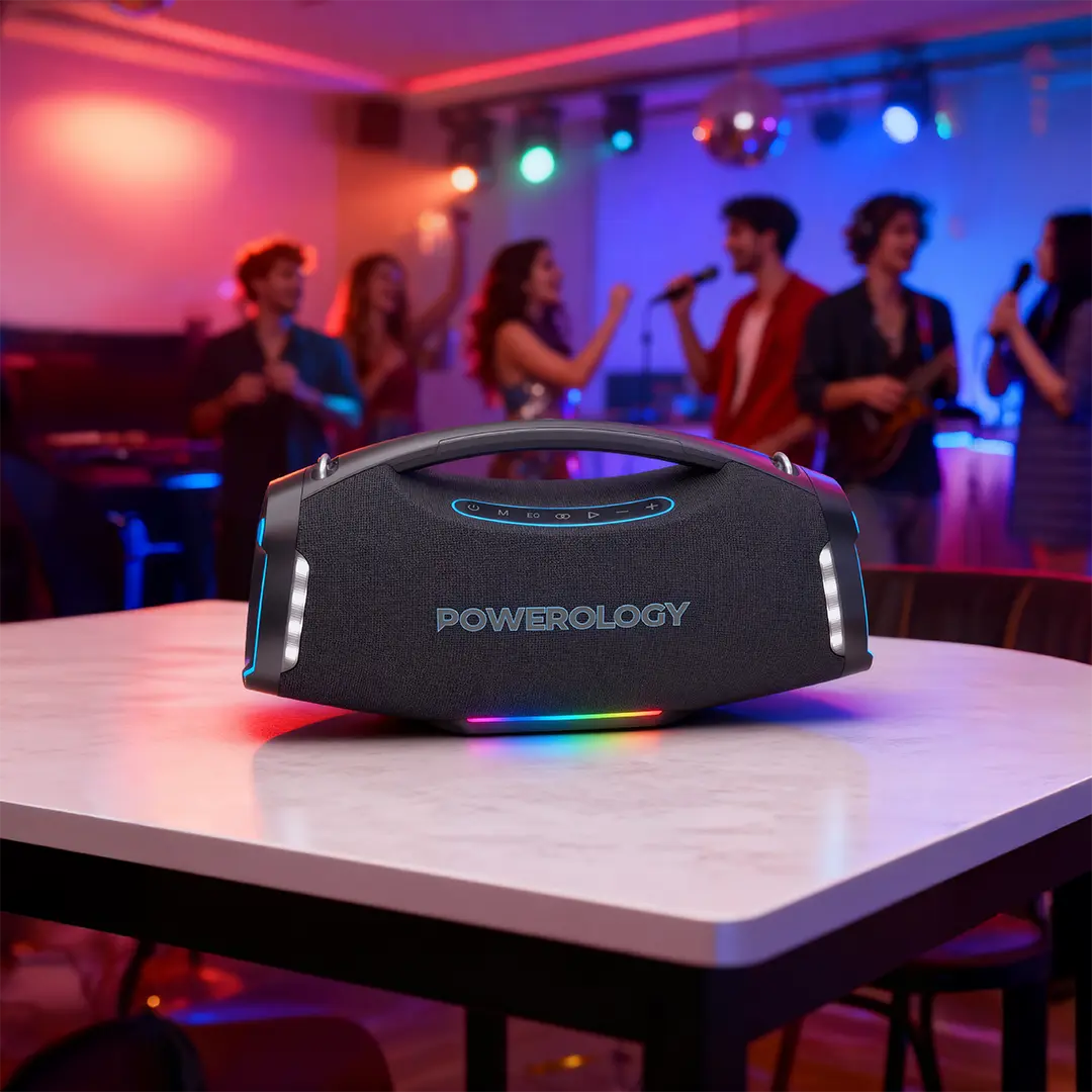 The Powerology Rock 350W RGB Lighting Speaker - Black produces sound through its 350W power capacity while its RGB lights create a colorful visual display. The TWS pairing feature enables users to connect two speakers, which creates a natural stereo sound experience, and the IPX5 water resistance makes the product safe for outdoor use in all weather conditions. The LED flashlight brings a useful function that enables you to operate it during times of limited visibility. The portable design and included strap make it easy to carry on the go, while the universal connection options ensure compatibility with a wide range of devices. The speaker provides 6 hours of playback time, which you can use after complete charging, and this duration makes it suitable for both parties and quiet home nights. The Green Lion Rock 350W Speaker combines its stylish design with powerful sound performance and portable features through its simple controls and quick charging capabilities.