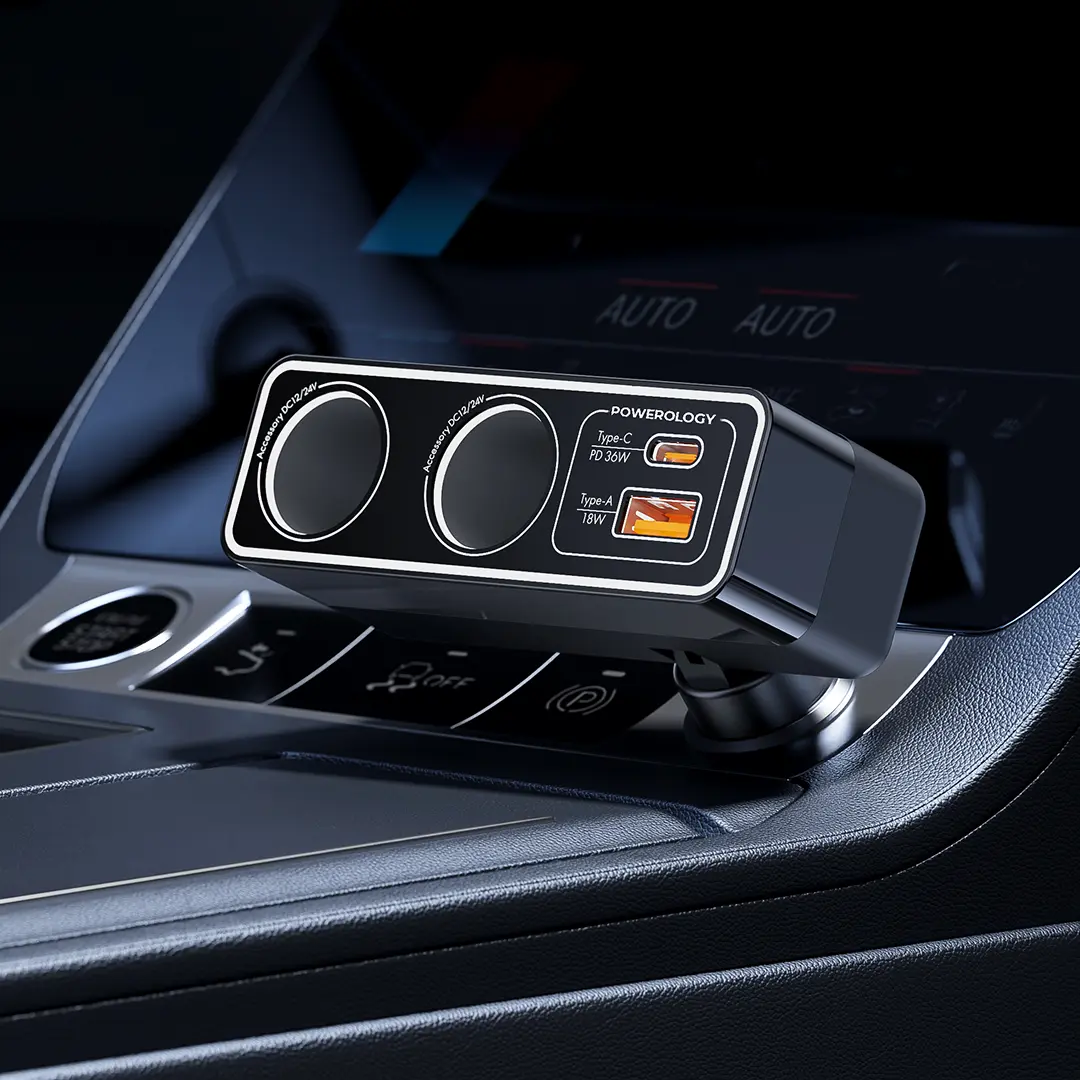 Providing a constant 54W of power, the Powerology Brio 54W Multi-Port Car Charger ensures that your devices remain fully charged even during extended journeys. Multiple devices can be charged at the same time. Such as mobiles, tablets, and any other USB-powered device. By enabling fast clock charging, your gadgets can get the energy fill they require in just a few minutes while the integrated safeguard ensures there won't be overheating or overcharging. This car charger has an 18W USB-A port and a 36W USB-C port for fast and efficient charging. The dual cigarette lighter sockets provide greater flexibility to charge additional devices or power other accessories. Designed for wide vehicle compatibility, it’s the ideal charger for keeping all your devices powered on the go.